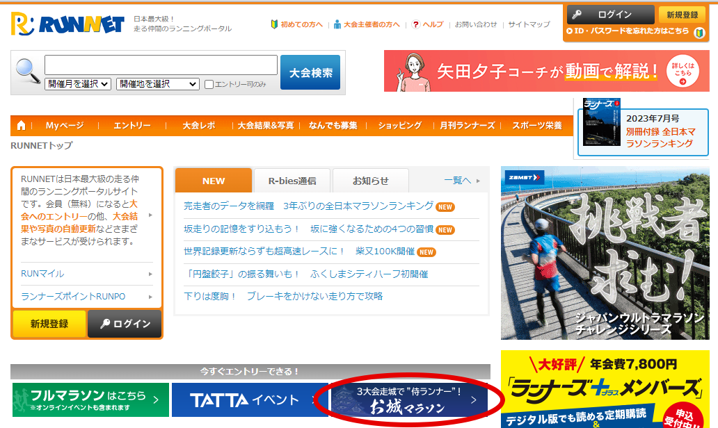 マラソン・ランニング大会のエントリーサイト『RUNNET』を開き、ログインして「お城マラソン」のボタンをクリックします。