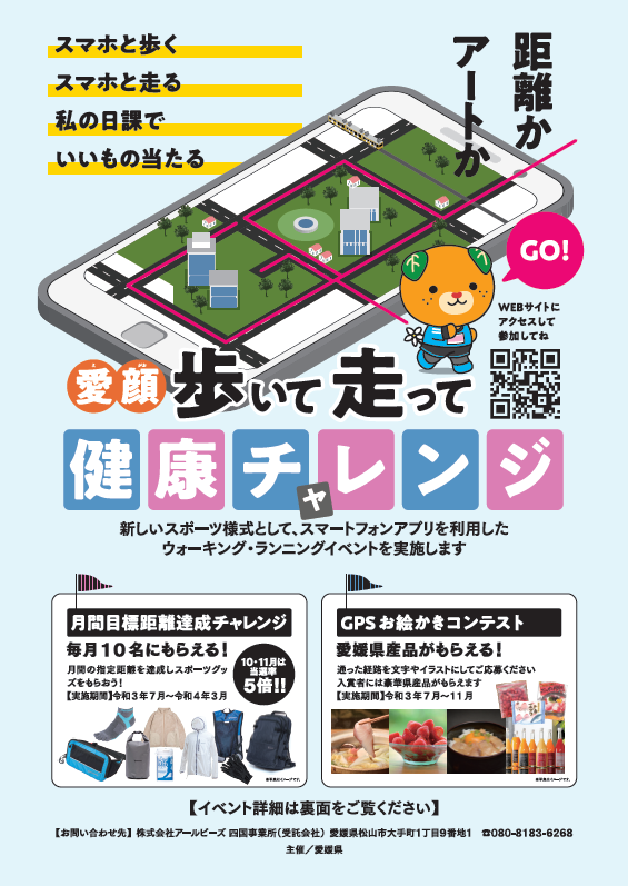 内容:1ヶ月間に指定距離または歩数を4回達成した方に、毎月抽選でスポーツグッズをお送りします。愛媛県在住の方はどなたでも参加可能です。
