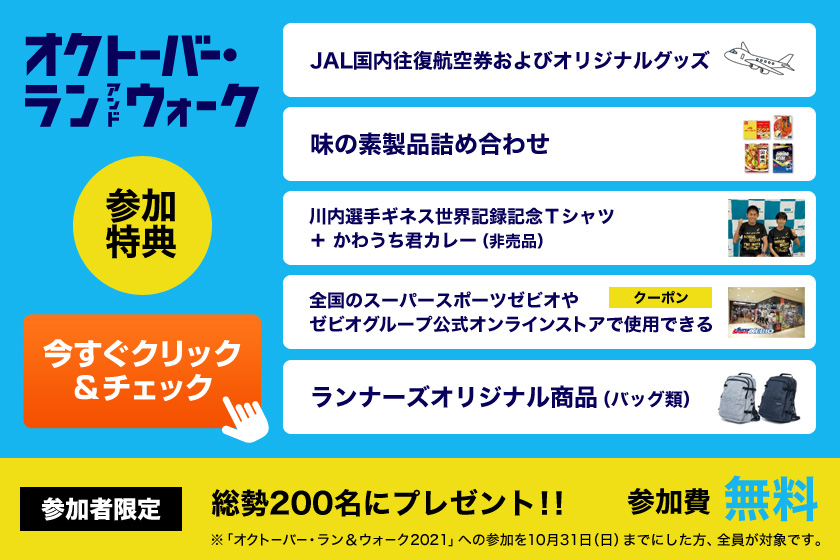 【参加者限定特典】総勢200名様に大会スポンサーからプレゼント! 2021.09.30 #イベント #オクトーバー・ラン&ウォーク2021 SHARE オクトーバー・ラン&ウォーク2021の開催がいよいよ明日に迫りました。 大会スポンサーからスペシャルプレゼントの詳細も発表されました。 国内往復航空券や非売品など、特典の詳細はコチラ からご確認下さい。 割引クーポンは参加者全員にもれなくプレゼントされますので、 まずは大会へエントリー下さい。 エントリーはこちら facebookでシェア Xでシェア LINEでシェア RELATED TOPICS関連するトピックス 今年も開催決定! 市民ランナー中距離レース「MDCチャレンジャーズ」 2025.04.15 #イベント さつきラン&ウォーク 企業対抗戦「さつきプレミアムプラン」のご紹介 2023.12.20 #イベント 【開催決定】さつきラン&ウォーク2024 企業対抗戦 2023.12.06 #イベント 「会社として新しい価値を創出していくためには、健康な心と身体で生き生きと、信頼できるチームで働くことが重要だ」 2023.12.05 #イベント 「走って歩いて大抽選会」当選者発表!! 2023.11.22 #イベント ふくい桜マラソン(福井県・福井市)/丸岡城・福井城址 2023.11.15 #イベント