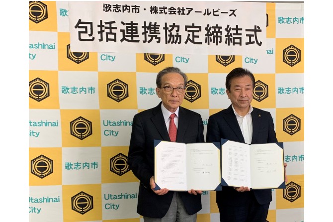 (右:北海道歌志内市 柴田一孔市長、左:株式会社アールビーズ 橋本治朗代表取締役)