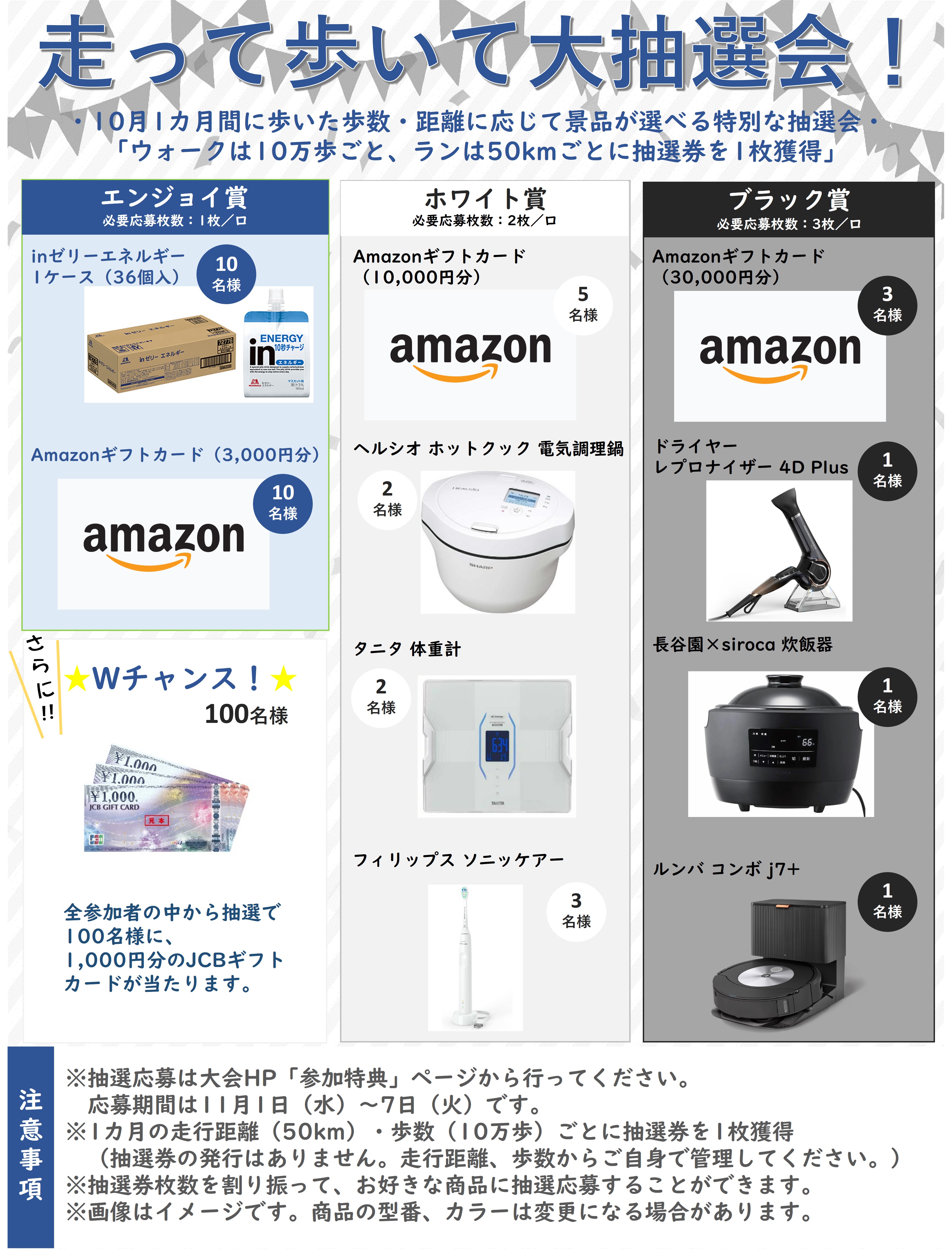 10月1ヵ月の総歩数・総走行距離に応じて、抽選に応募できる抽選券をプレゼントします。
