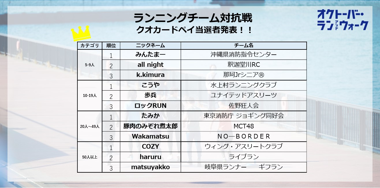 人数カテゴリー別の上位3チームの参加者の中から抽選でクオカードペイを以下のとおりお送りします。