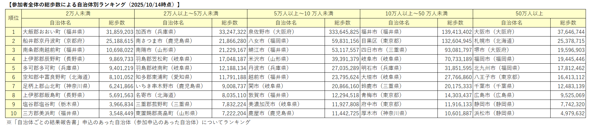 参加者を増やすための自治体様の告知への取り組みに対する表彰として、10月1ヵ月間の「参加者全体の総歩数」の上位10自治体を表彰します。