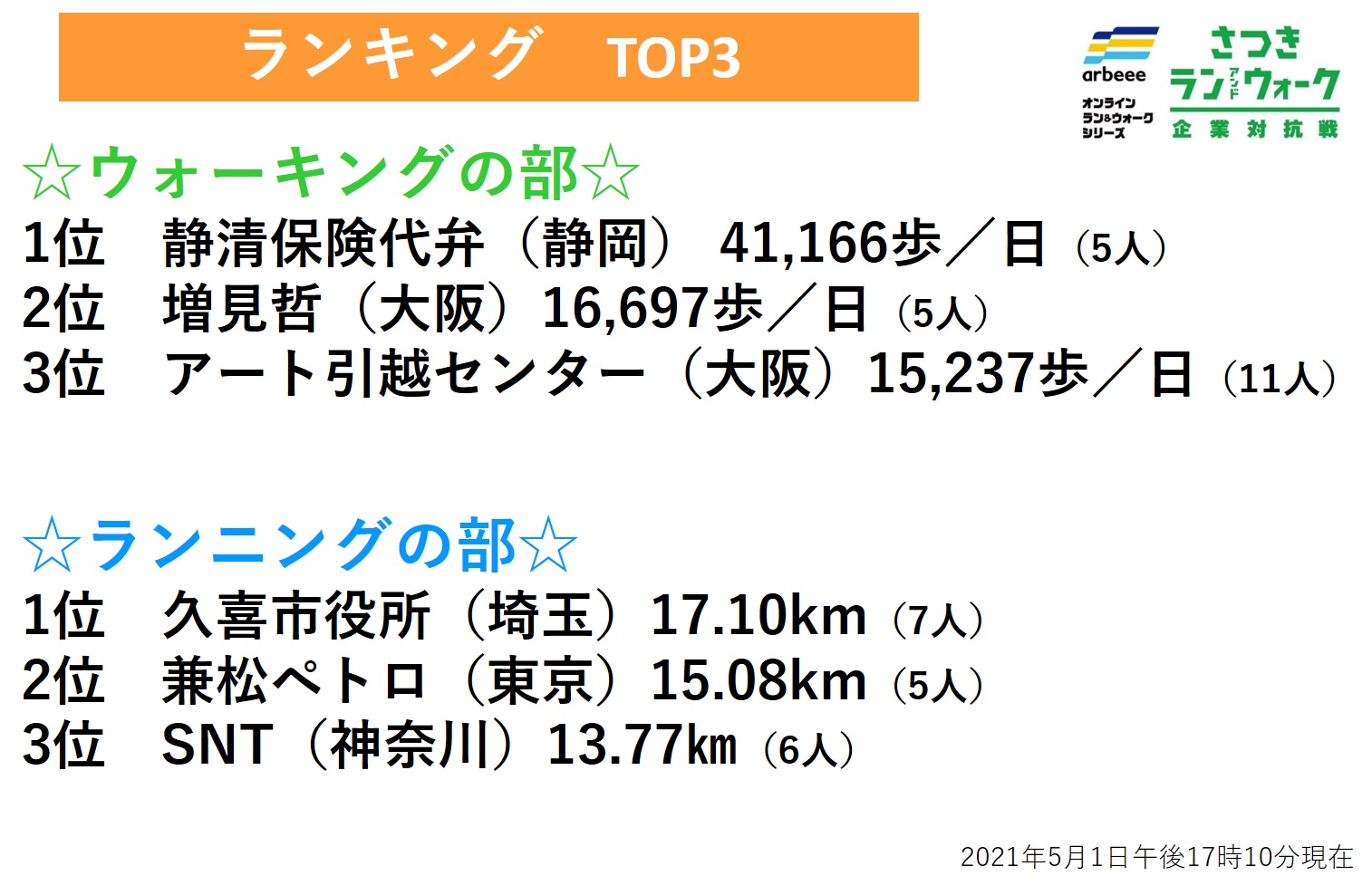5月1日(土)17時10分時点の「ウォーキングの部」「ランニングの部」の上位3社は下記の通り。