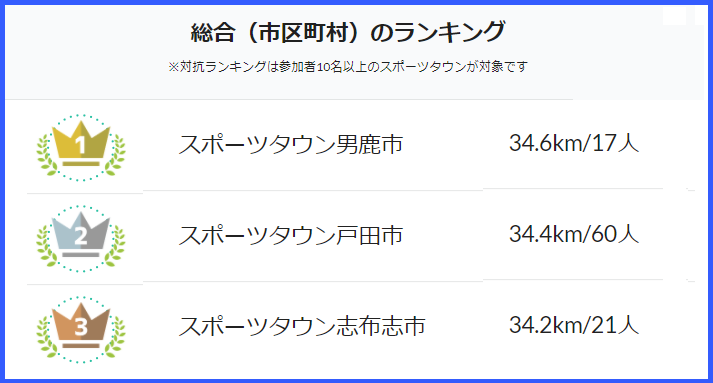 全国137の自治体にお住まいの参加者の平均走行・歩行距離を集計し、“日本一走るまち”を決めるランキングです。